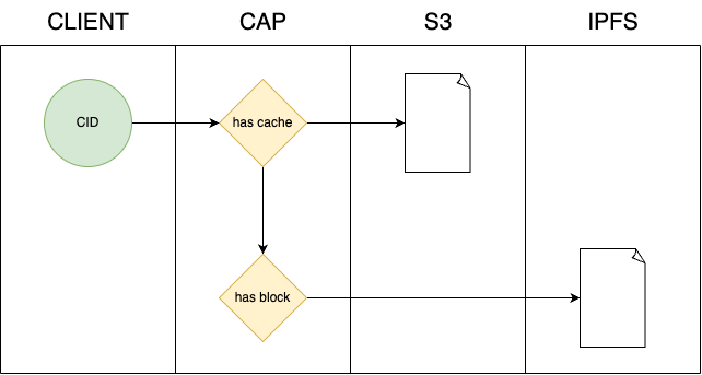 - Retrieval Flow: Content is requested with the CID, and will fetch from the cache, in the case where it is not available it will fallback on IPFS