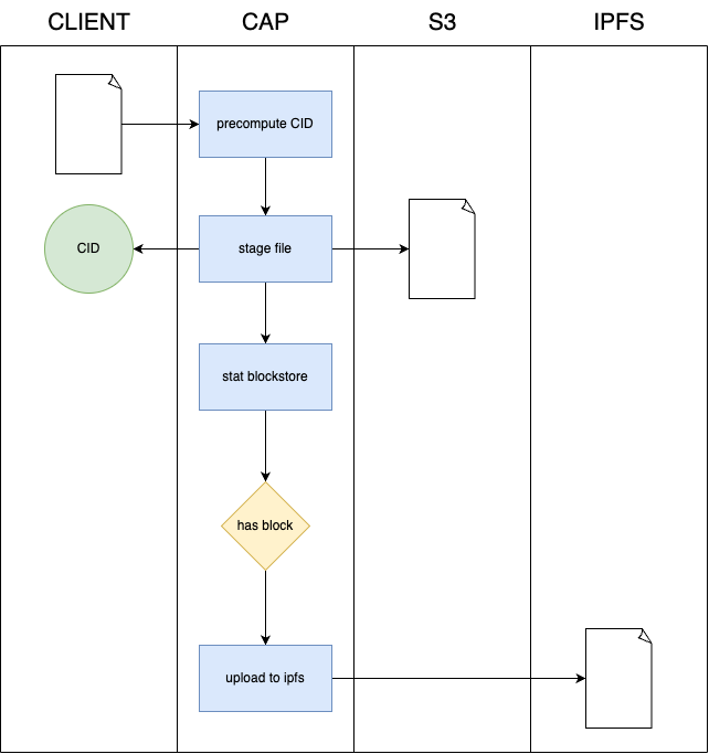 morfd-cap uses a content-addressable approach to cache data in cloud block storage before finalizing submissions to IPFS. During uploads, morfd-cap proxies the data to cloud storage and returns a precomputed CID prefix for immediate reference. Likewise, CIDs can be used to fetch data from morfd-cap, which maps them back to their underlying storage. This architecture provides a high-performance buffering layer between clients and IPFS and seamlessly interfaces with both public and private IPFS nodes.