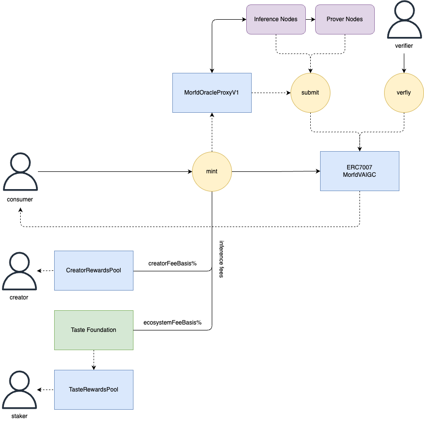 - Creator Monetization: Automates the distribution of inference fees (or “minting fees”) between creators and the broader Taste ecosystem.