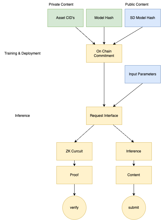 - By verifying these references (model hash, LoRA hash, input data CID) and reproducing the same inference steps, third parties gain confidence that the claimed LoRA and data produced the stated result—without the LoRA ever being revealed.